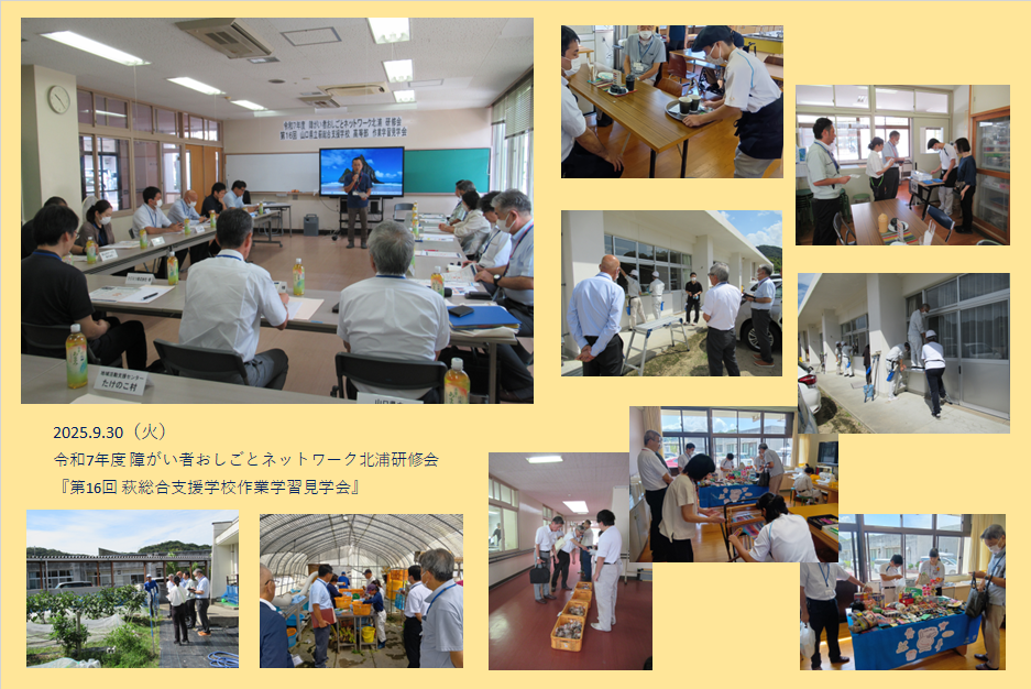 令和7年9月30日(火)山口県立萩総合支援学校にて「令和7年度 障がい者おしごとネットワーク北浦研修会 第16回 萩総合支援学校作業学習見学会」を開催しました。今回は北浦地域の事業所10社のご参加がありました。 本見学会は北浦地域の事業所の方々に、萩総合支援学校の作業学習を見学していただき、障がいのある生徒さんに対する理解を深めていただくことを目的としています。 参加者の皆様は4つのグループに分かれて「喫茶・清掃・農園・ものづくり」各班の作業学習を見学されました。各班の様子は以下の通りで、いずれの作業班も生徒さんの生き生きとした顔が印象的でした。