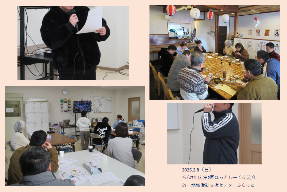 2月8日(日)に「地域活動支援センターふらっと」の活動室にて、第2回ほっとわーく交流会(在職者交流活動)を開催しました。当日は雪が舞う中での開催でしたが、7名の方にご参加いただきました。 今回は「今年度の仕事を振り返り、来年度の抱負を語り合いましょう」のテーマのもと参加者の皆さんに各々の思いを発表していただきました。 「今年度は新しい仕事を覚えた」「今の仕事を続けられるよう頑張ります!」「健康を大切にしたい」等々、ワークシートに記入した皆さんの率直な思いを発表することで、共感・共有することができました。 発表後、希望者にはふらっと備え付けのカラオケを使って自慢の歌声を披露していただきました。歌を聞いて楽しまれている方もおられ、皆さんのストレス解消等につがったのではと思います。 最後は会場向かいの「酒ト定食はっち」で食事をしながら、それぞれの職場での昼食事情などを話し合い、楽しい時間を過ごすことができました。参加された皆様、誠にありがとうございました。 |